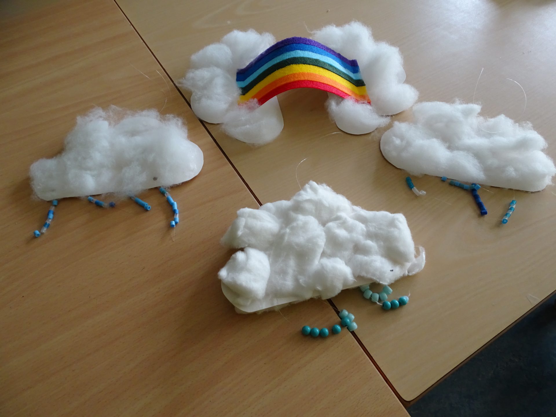 Nein, wir basteln in der Kita nicht nur. Aber auch. Und wir machen es gern. Denn neben der Freude und Kreativität der Kinder fördert es die Konzentrationsfähigkeit, die Geduld und die Hand-Augen-Koordination sowie Feinmotorik. Eine ganze Menge wertvoller Dinge entstehen also beim Basteln. So wie zum Beispiel die 3D Wolken im Spatzenbereich der Kita Villa Murkelmaier. Mit Hilfe einer Pädagogin schnitten die 3-6-Jährigen eine Wolke aus Papier aus und beklebten diese von beiden Seiten mit Watte. Für die Regentropfen wurden Bügelperlen aufgefädelt und an die Wolke geknotet. All dies wurde mit einem von den Kindern gestalteten Regenbogen verbunden.