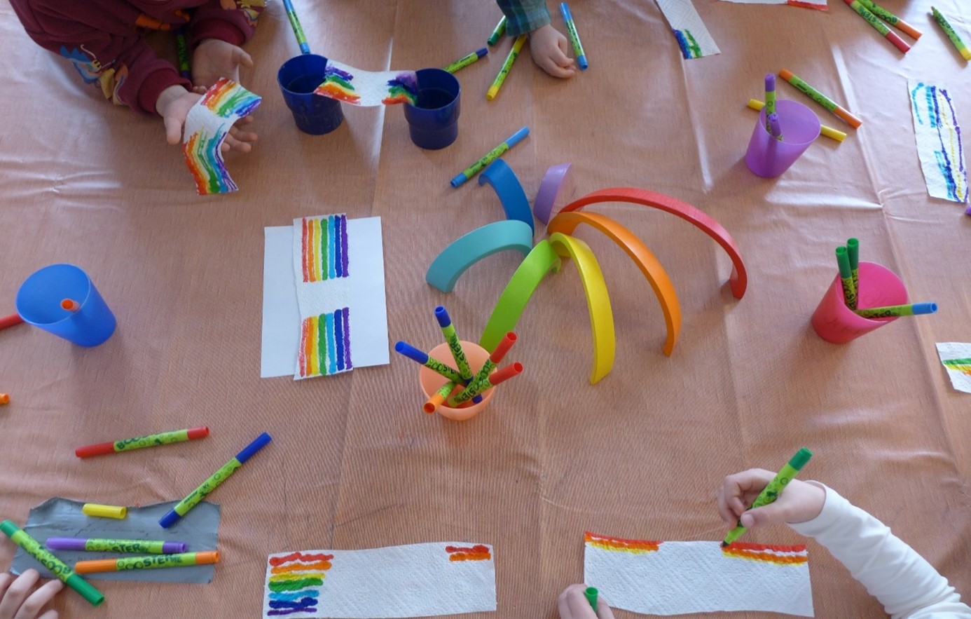 Bei diesem Experiment lassen die Kinder der Kita Pusteblume einen Regenbogen „wachsen“. Dafür malen wir mit Filzstiften dicke Striche in den sieben Regenbogenfarben auf einen Streifen Küchenkrepp und tauchen diesen …