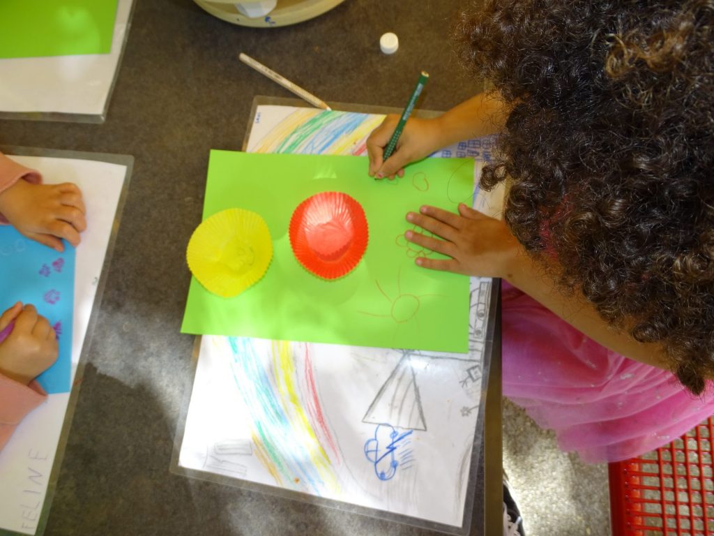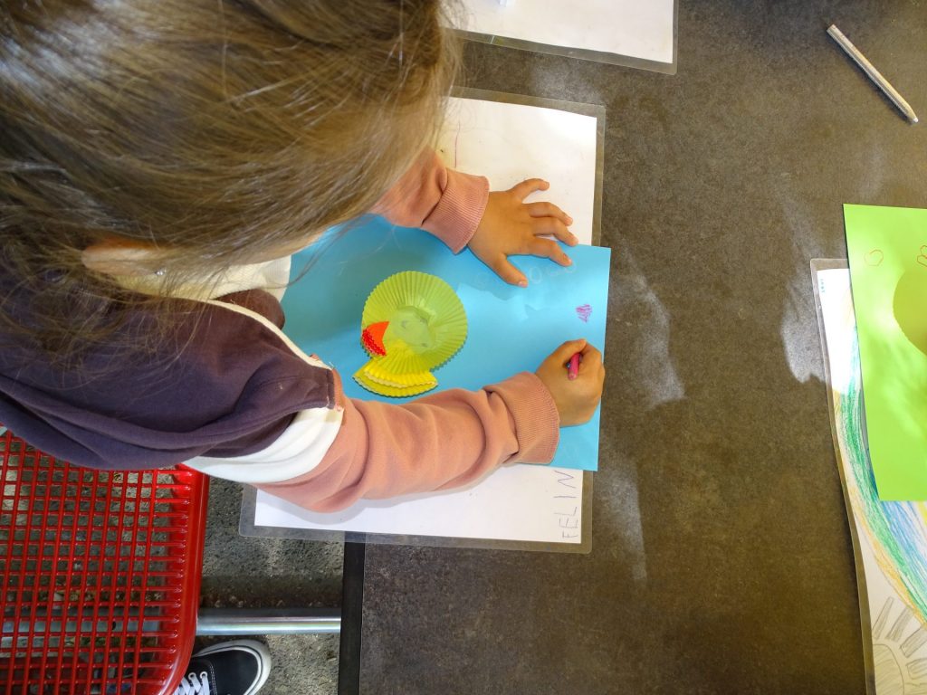 Für die fantasievollen Entdecker der Kita Villa Murkelmaier gibt es regelmäßig Kreativangebote im grünen Garten. Das Werkeln unter blauem Himmel bietet Freiheit für Ideen und Vielfalt. Dabei entstehen die buntesten Kreationen. Wie zum Beispiel die einfallsreich gestalteten Fische und Blumen aus Papiermuffinformen. Oder auch das große Gemeinschaftsbild, welches aus selbst gemischter Kreide mit Pinseln auf Steine gemalt wurde. Hierfür haben die Kinder zusammen mit einer Pädagogin folgendes Rezept verwendet: In einem Becher 2-3 EL Kartoffelmehl, 50ml Wasser, Lebensmittelfarbe, mit einem Pinsel gut verrühren. Fertig.