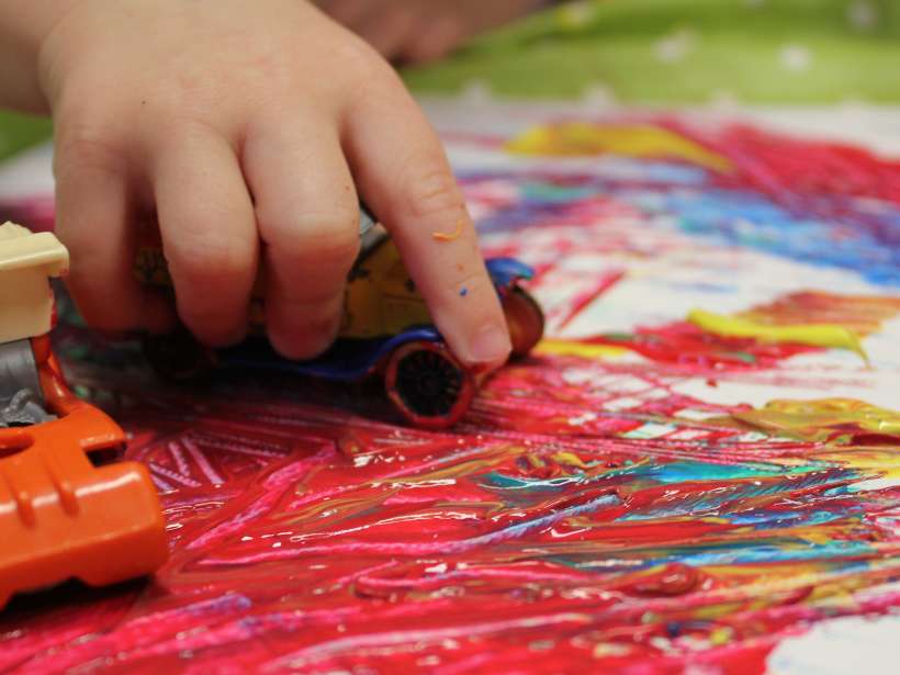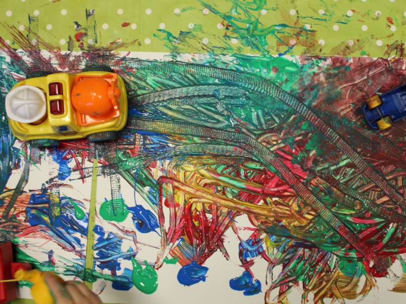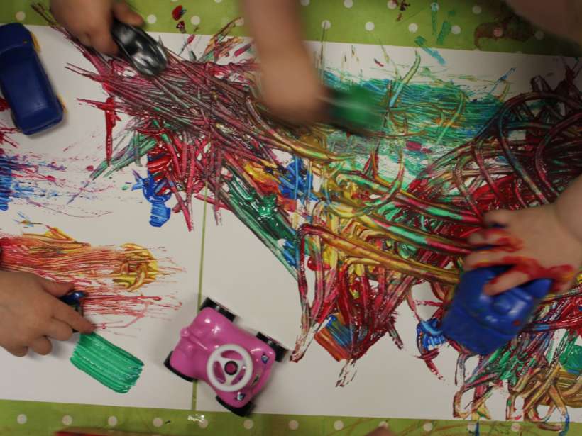 Die Nestkinder aus der Kita Fairplay hatten Raum für kreative Aktivitäten mit fantasievollen Elementen. Mit einigen Spielzeugen lassen sich wunderbar Mikrokosmen des täglichen Lebens oder Fantasiewelten erschaffen. Hier haben die Kinder verschiedenste Fahrzeuge durch Farbklekse fahren lassen, wodurch großartige Effekte entstanden sind. Dabei haben sie sich kreativ und frei auf dem Papier ausgetobt. Die Kinder lernen den Zusammenhang zwischen der Bewegung und der Farbspur zu erkennen. Dies fördert eine positive Selbstwirksamkeit.