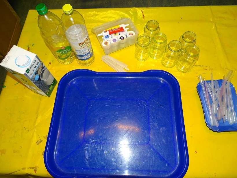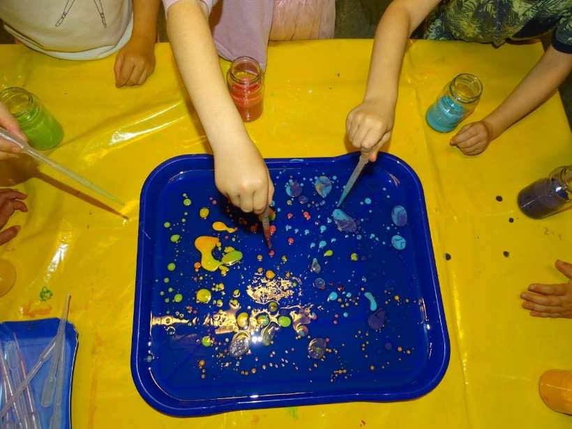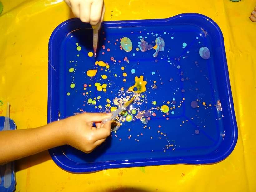 Beim zweiten Angebot wurde ein tiefes Tablet mit Öl befüllt, so dass der Boden ganz bedeckt war. Anschließend haben die Pädagoginnen gemeinsam mit den Kindern Lebensmittelfarbe mit Milch gemischt. Nun konnten die Kinder mit den Pipetten einzelne kleine oder große Tropfen der Mixtur auf das Tablett klecksen lassen und beobachten, wie die verschiedenen Flüssigkeiten miteinander reagieren. Die Kinder können untereinander die Farben tauschen und beobachten, wie sich die Farbtropfen vermischen und noch weitere Farben entstehen.