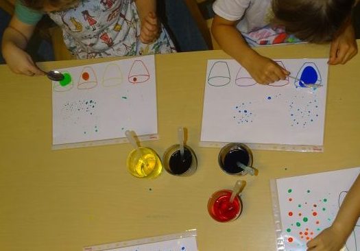 Beim ersten Angebot wurde Lebensmittelfarbe mit Wasser vermischt. Auf ein Blatt haben die Pädagoginnen Gläser oder andere Gefäße gemalt. Das bemalte Blatt wurde in eine Klarsichtfolie gesteckt. Mit Hilfe der Pipette und eines Löffels konnten die Kinder die Gefäße “befüllen”.