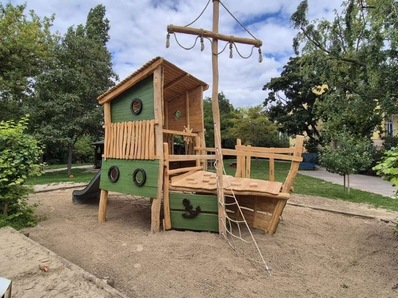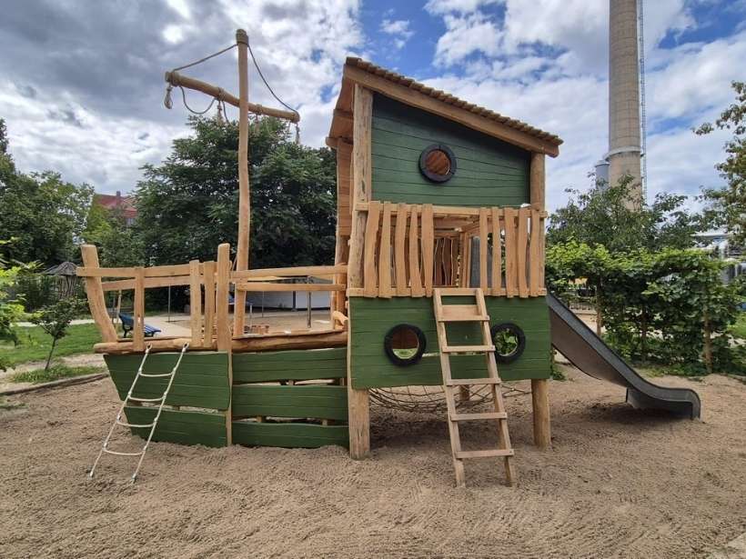 Aus robustem Holz entstand ein großes Spielschiff in der Kita Kinderakademie. Dieses verschönert nun den Außenbereich. Für die Kinder bietet dieses neue Spielgerät viele Möglichkeiten. Es lädt zum Rollenspiel, Klettern oder auch zum Rückzug ein. Hier werden Fantasie, Grobmotorik und der Gleichgewichtssinn der Kinder gefördert.