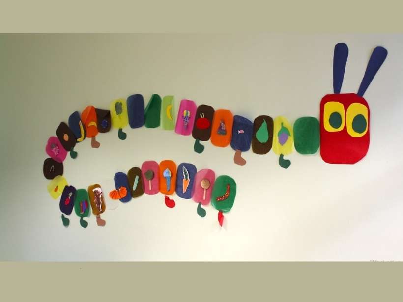 Die kleine Raupe Nimmersatt ist in dem Essensraum der Kita Fairplay zu Gast. Sie ist groß, bunt, voller selbst gestalteter Lebensmittel und hat den Kindern einiges beigebracht.