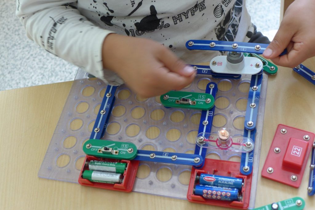 Die Kinder der Kita Pusteblume wollen hochhinaus. Sie gehen der Frage nach, wie der Stromkreis eines Elektrobaukastens aufgebaut werden muss, um einen Propeller zum Drehen zu bringen. Faszination Physik. Durch eine leichte und bebilderte Schritt für Schritt Anleitung, können die jungen Forscher mit Hilfe einer Pädagogin über ein simples Klicksystem selbstständig den Stromkreislauf aufbauen. Beim Experimentieren lernen sie die Grundlagen der Elektrotechnik kennen. Diese Art des Spielens hilft den Kindern, abstrakte Ideen zu verstehen und macht das Erlernen der MINT-Fähigkeiten interessanter und unterhaltsamer. Des Weiteren wird die Kreativität und Fantasie, Hand-Auge-Koordination und auch die Selbstständigkeit der Kinder gefördert.